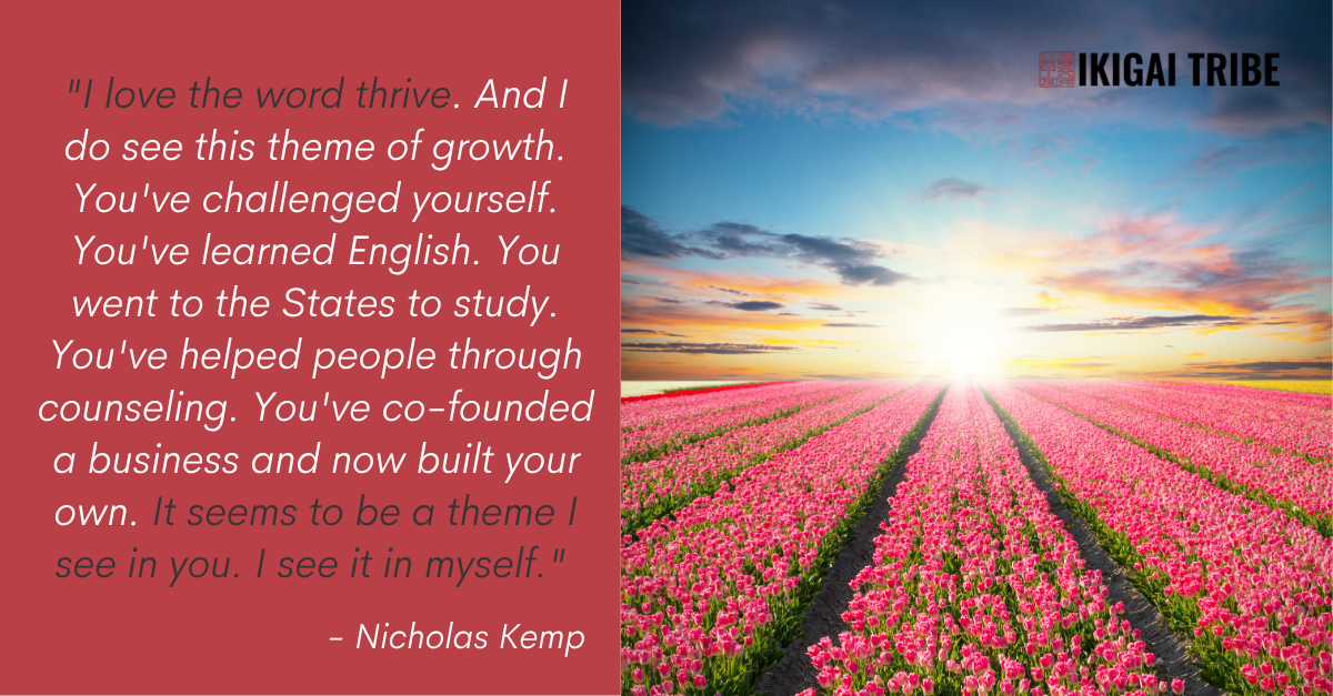 "I love the word thrive. And I do see this theme of growth. You've challenged yourself. You've learned English. You went to the States to study. You've helped people through counseling. You've co-founded a business and now built your own. It seems to be a theme I see in you. I see it in myself."